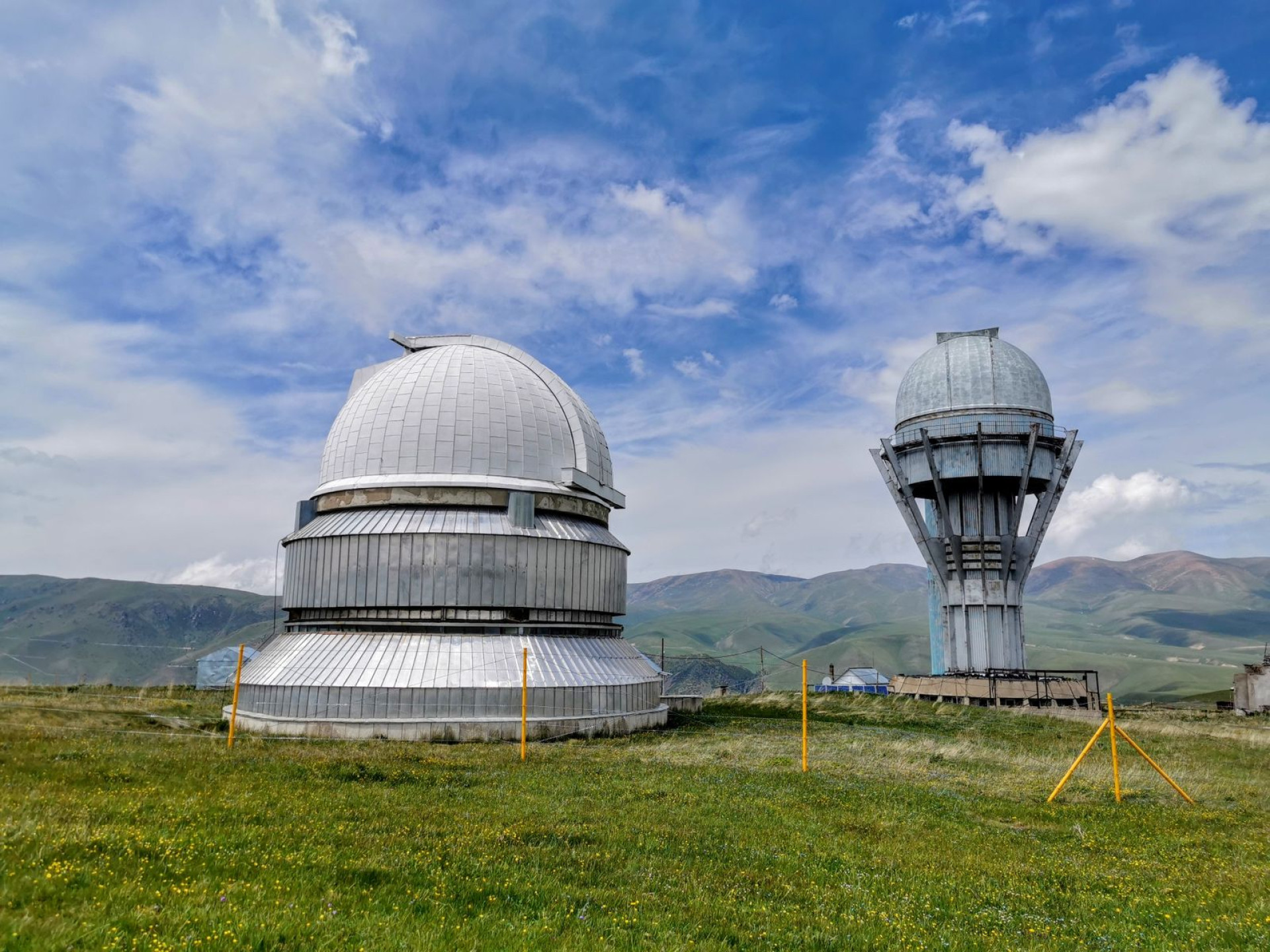 Вокруг — зелёные склоны, чистое небо и ощущение простора. Вдали, за холмами, виднеется купол недостроенной космической станции, которую в народе называют "Чупа-чупс". До неё можно добраться по ровной грунтовой дороге — путь занимает всего несколько минут.