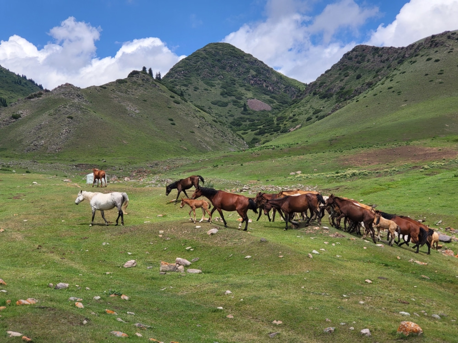 Несколько панорамных кадров — и дальше в путь. Обогнув гору слева, дорога уходит выше, мимо табунов лошадей, по всё более открытому пространству.