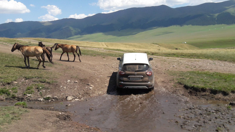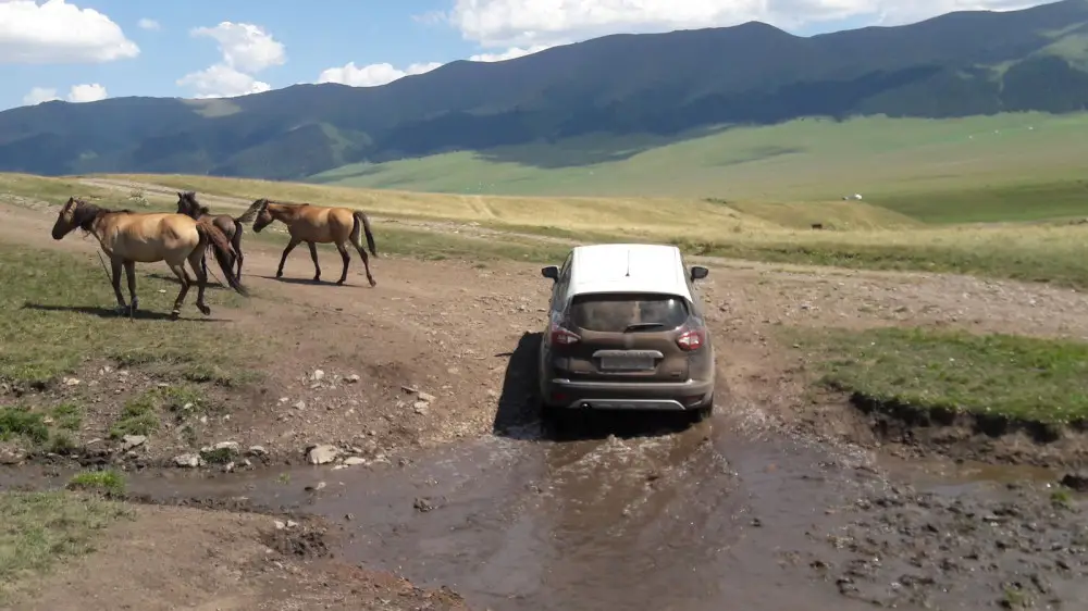 Пейзаж меняется на глазах: зелёные участки чередуются с сухими склонами, перед машиной то и дело мелькают зайцы, сурки и другие степные обитатели. И всё это — без связи, без инфраструктуры, вне привычного ритма.