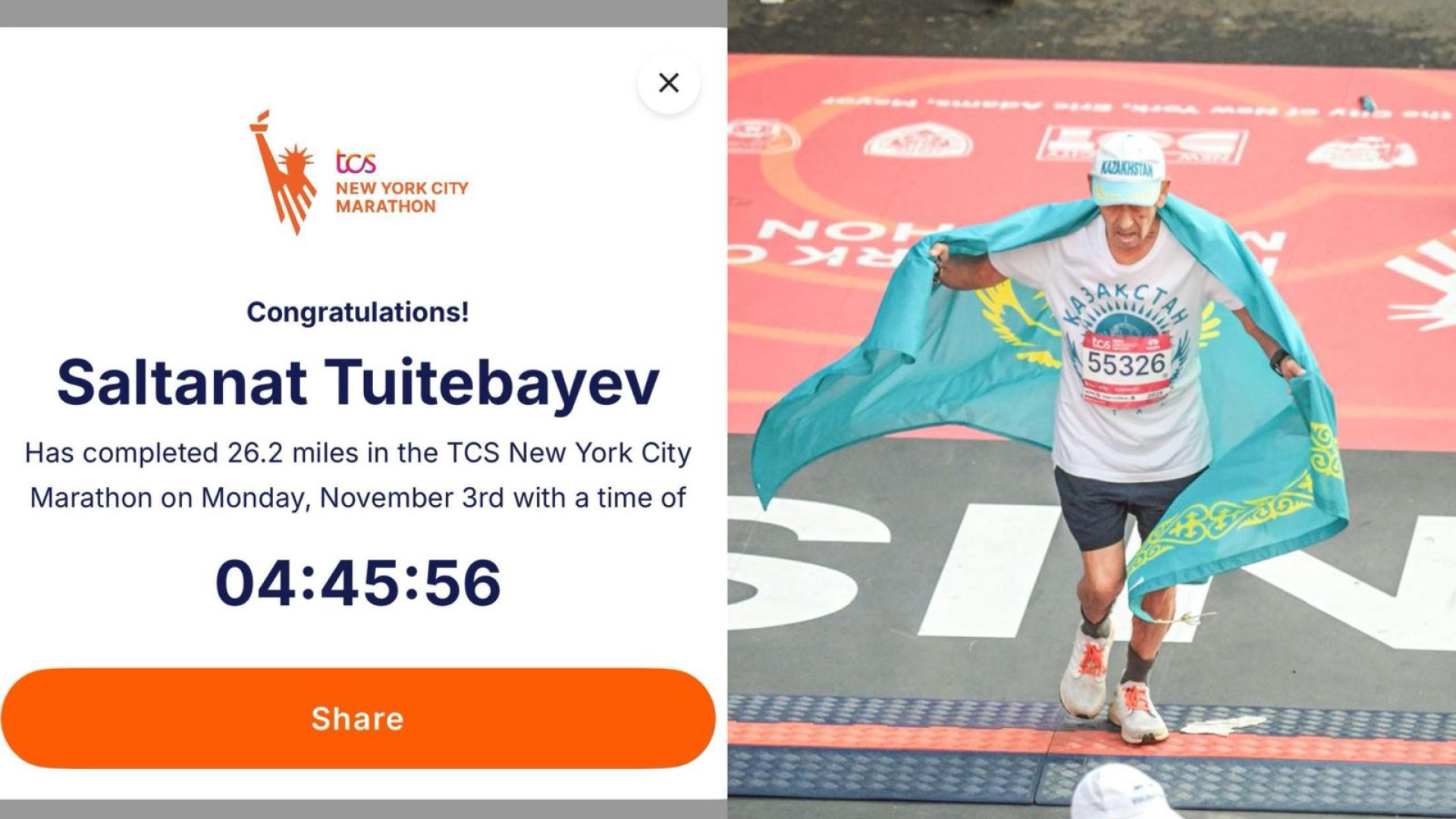 2 ноября в Нью-Йорке прошёл один из самых престижных марафонов мира — TCS New York City Marathon, собравший более 55 тысяч участников из разных стран. Внимание казахстанцев привлек 80-летний Салтанат Туйтебаев из Жамбылской области, показавший один из лучших результатов в возрастной категории 80–85 лет. Он преодолел дистанцию 42,2 километра за 4 часа 45 минут 56 секунд и занял второе место среди сверстников.