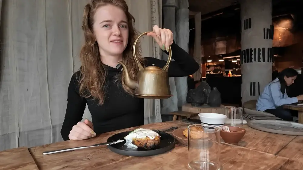 На второй день путешественница намеревалась поехать на Чимбулак. На автобусе она доехала до Медео, но дальше с попутчицей они не поднимались. Девушки посетили известный ресторан тюркской кухни, где попробовали баурсаки, казахский чай с молоком, десерт, самсу. К слову, девушке еда понравилась, однако иностранка отметила, что порции в ресторане были не такими большими. Полный восторг у нее вызвал только чай с молоком.