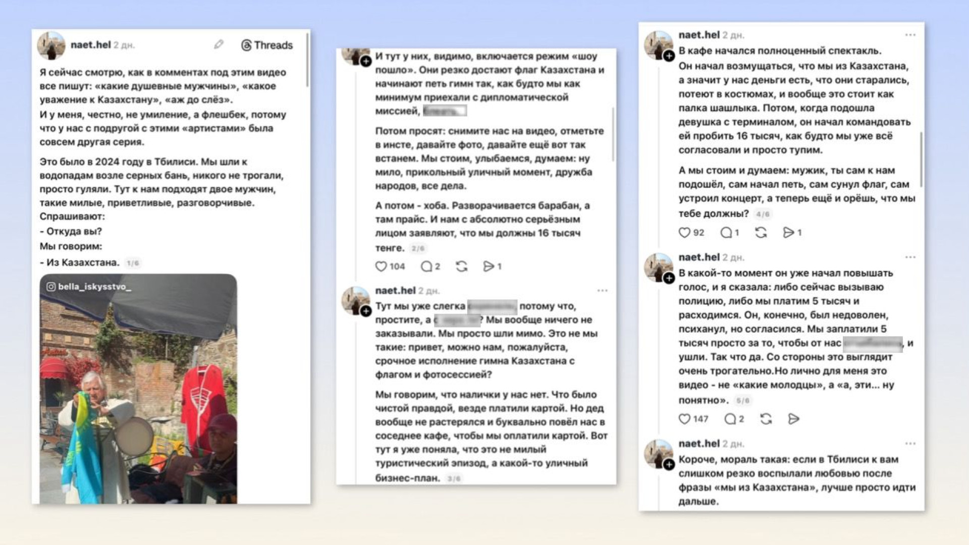 История с уличными музыкантами в Тбилиси, которые встречают туристов из Казахстана с флагом и исполнением гимна, вызвала бурное обсуждение в сети. Пока одни увидели в этом жест дружелюбия, другие рассказали о похожих случаях, после которых с гостей неожиданно требовали деньги. Подробности — в материале Tengri Travel.