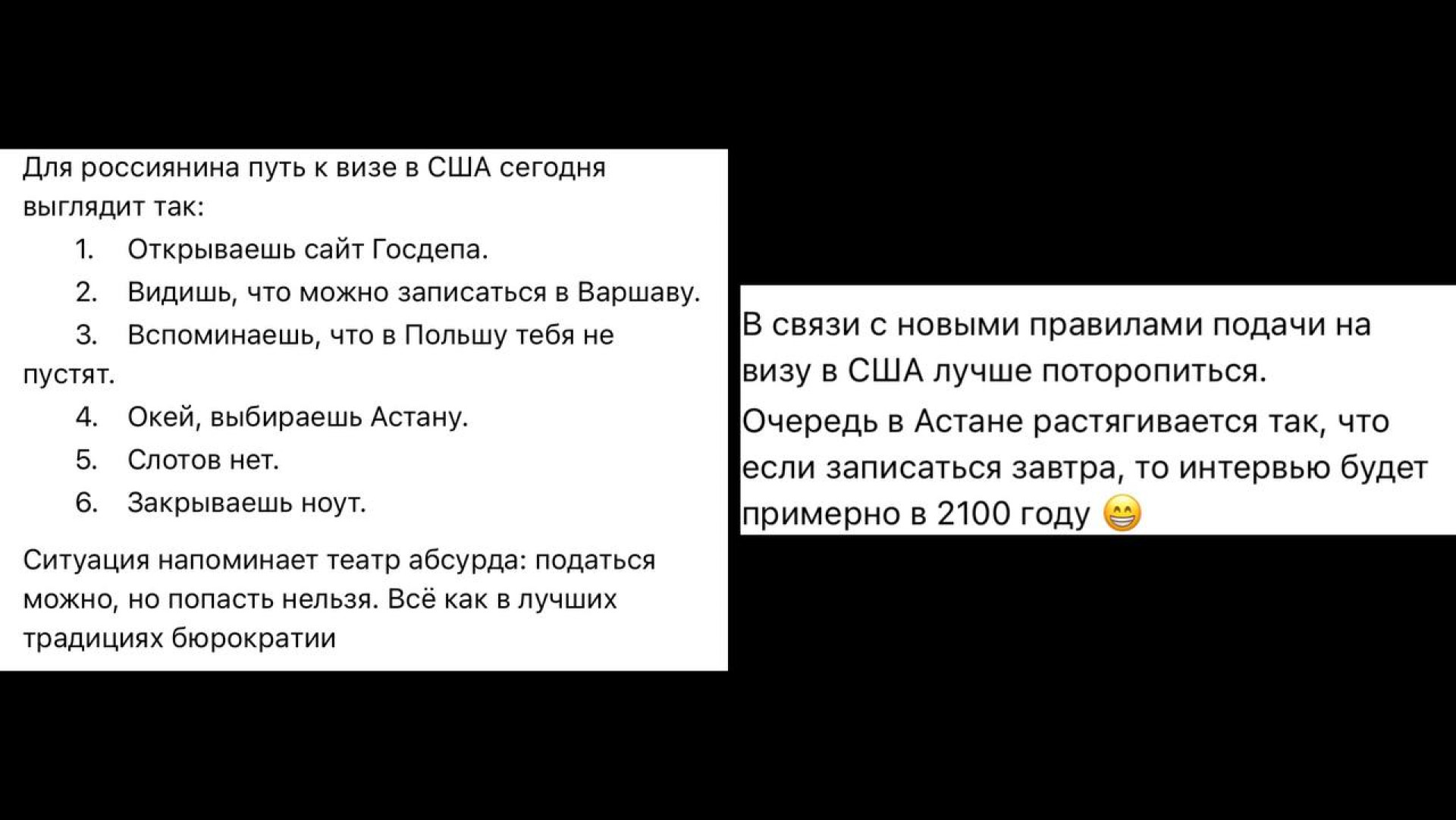"Открываешь сайт Госдепа, видишь, что можно записаться в Варшаву, вспоминаешь, что в Польшу не пустят. Окей, выбираешь Астану — слотов нет. Закрываешь ноут", — написал один из пользователей сети.