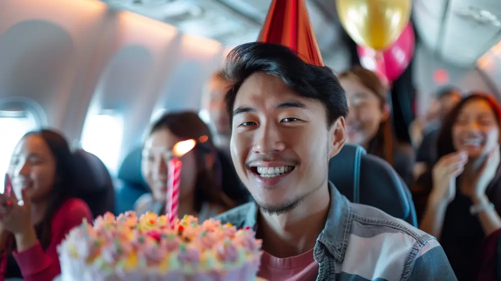 Оказалось, что пассажирам всех регулярных рейсов этой компании доступна услуга "Поздравление на борту". После набора высоты экипаж поздравит именинника, юбиляра или семейную пару.