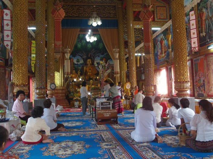 Рядом с этим храмом, в приделе другой пагоды, высится огромная статуя сидящего в позе лотоса другого святого - на контрасте толстого, в ярких алых одеяниях и с веселым взглядом. Это благочестивый монах-отшельник Тан Пхра Маха Кацан. В жизни он был столь прекрасен, что ввергал в искушение своих поклонниц. И тогда он нашел способ избавиться от этого греха: стал есть в немеренных количествах и превратился в толстого и непривлекательного. Этот образ очень популярен в здешних местах, но все же такое соседство с предыдущими святыми несколько обескураживает. А если вспомнить еще о застывших напротив духах-нагах со змеиными головами, то понимаешь: без просветления уместить это все в одной голове невозможно.