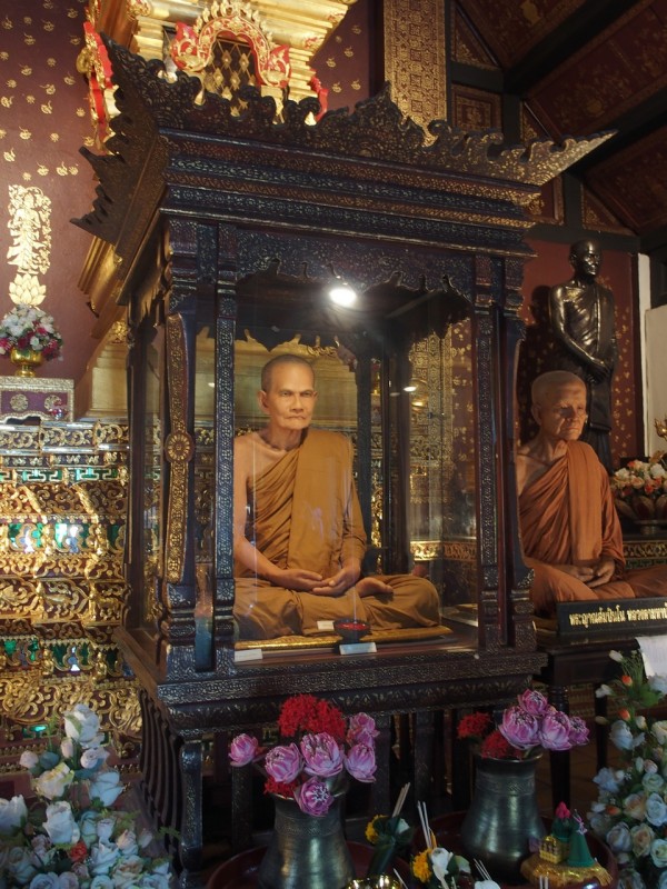 Сегодня Ват Чеди Луанг - это не только центральный храм, а целый комплекс пагод, приделов, вихар разных времен и назначения. В западной части здесь имеется маленький храм, который можно назвать в каком-то смысле обитаемым. Когда я зашел внутрь (а в храме не было ни души), то на мгновенье оторопел: застывшие у алтаря в позе лотоса два пожилых монаха в желто-оранжевых буддийских одеяниях буквально пронзили меня суровым оценивающим взглядом. Лишь несколько секунд спустя я понял, что они не живые, а сделаны, скорее всего, из воска. Один из монахов - как позднее я узнал, преподобный Бхуридатто - был помещен в прозрачный стеклянный саркофаг.