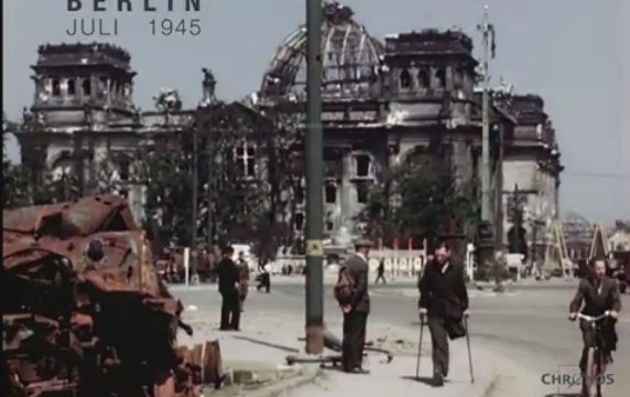 В Сети появилась уникальная видеозапись в "цвете", на которой запечатлен Берлин в июле 1945 года, спустя 2 месяца после объявления о капитуляции Германии. Кадры в высоком разрешении опубликовал в Интернете Костантин фон цур Мюэлен в рамках проекта компании Kronos Media. В июле 1945 года Берлин уже был поделен между союзниками на четыре зоны влияния. В городе уже появились первые таблички с обозначениями улиц на русском языке, а в центре города установлен плакат с изображением генералиссимуса Иосифа Сталина. Неизвестный оператор снял разрушенные здания Рейхстага и Бранденбургские ворота, а также руины на центральной площади Александерплац, остатки военной техники и жителей, разгребающих завалы в городе. На видео попал городской трамвай, запущенный незадолго до съёмок. Часть кадров является данными аэрофотосъемки, сделанной с относительно небольшой высоты именно они позволяют оценить масштабность разрушений, которым подверглась столица Германии.