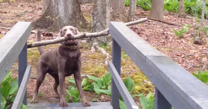 Более двух миллионов просмотров за несколько дней набрало видео с находчивым псом. В ролике описывается ситуация, с которой столкнулась собака. Ей необходимо протащить длинную палку через узкий мост. Забавно наблюдать, как пес ищет решение проблемы: он пытается преодолеть препятствие с разбега, нещадно кусает палку, скулит от раздражения, но в итоге все-таки протаскивает ствол боком.