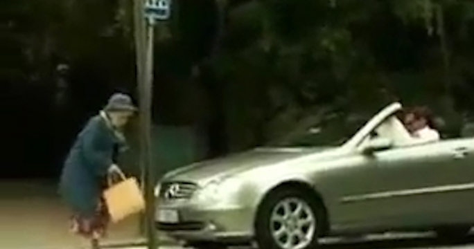 Старушка намеревалась перейти дорогу по пешеходному переходе. Но, видимо, уснув на "зебре" осталась на месте. Водитель автомобиля, посигналив несколько раз, намеревался поторопить пожилую женщину. В ответ она несколько раз ударила машину по фарам сумочкой. Из-за физического воздействия у авто сработали подушки безопасности, прижав водителя к сидению. Пользователи в комментариях, подшучивая над водителем, пишут, что это возмездие от бабули.