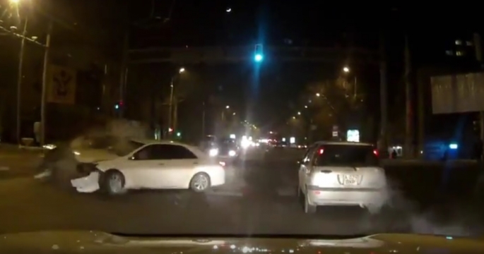Столкновение двух авто в Алматы попало на камеру видеорегистратора