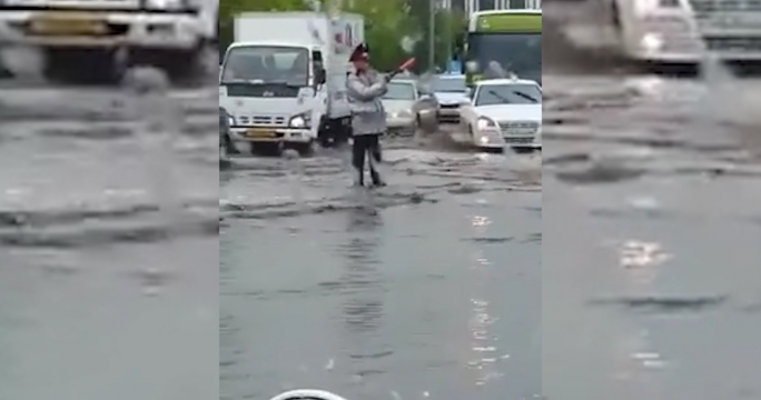 Видео с регулировщиком посреди затопленной улицы Астаны обсуждают в Сети