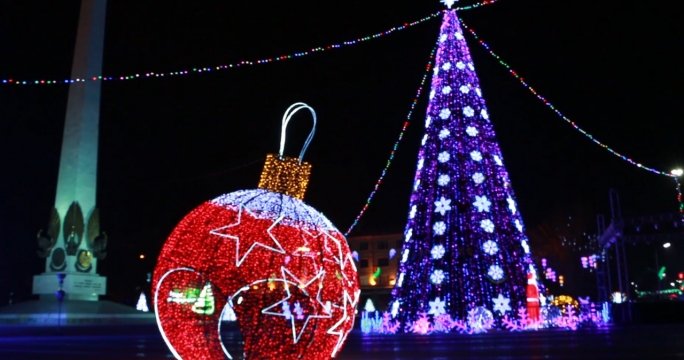 Традиционно в каждом из городов Казахстана установлена елка, украшенная разноцветными гирляндами и яркими шарами. Отличился в этом году Петропавловск. Там главную площадь украшает инновационное дерево - Led-елка. Столица в последние дни уходящего года превратилась в сказочный городок. Иллюминация, огромные стеклянные шары, деревянные домики и, конечно же, символ Нового года - коза - придали шарм и волшебство строгой столице. Алматы украсили еще месяц назад. Главная елка мегаполиса расположилась на площади Республики. Сани Деда Мороза и милые снеговики украсили центр Караганды, а в Усть-Каменогорске горожан возле елки развлекают настоящие лошади - символ уходящего 2014 года.