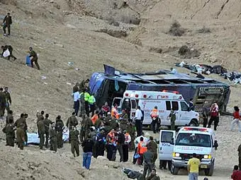 Автокатастрофа произошла во вторник в 60 километрах от курортного города Эйлат на юге Израиля. Туристический автобус, перевозивший группу туроператоров из Петербурга, упал в пропасть. В аварии погибло 25 пассажиров, из них 24 россиянина. Еще 25 человек получили ранения различной степени тяжести. Эта авария стала самой крупной за всю историю Израиля. По предварительным данным, причиной стало лихачество водителя, который пошел на обгон и не справился с управлением. В настоящий момент пострадавших осматривают российские врачи вместе с израильскими коллегами.