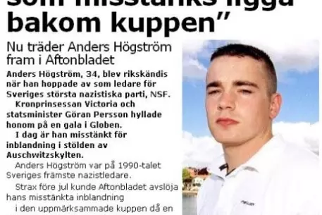 По версии польских правоохранительных органов, Хегстрем был заказчиком кражи в Освенциме, для чего весной 2009 года даже специально приезжал в музей "Аушвиц-Биркенау", организованный на месте лагеря. В конце декабря сообщалось, что вывеску похитили члены шведской нацистской группировки с целью ее дальнейшей продажи. На вырученные деньги они якобы хотели организовать серию нападений на главных лиц Швеции.