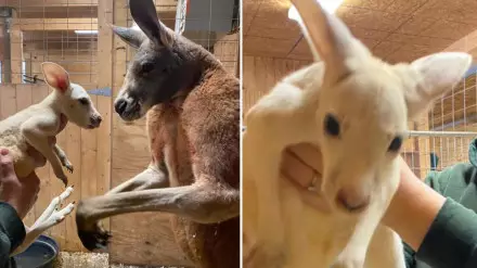 Детеныш красного кенгуру родился с редким заболеванием - лейкизмом, с мутацией, вызывающей частичную потерю пигментации наружного покрова у животных. Догадки работников зоопарка подтвердило то, что у кенгуру черные глаза, так как лейкизм не влияет на пигментацию глаз.