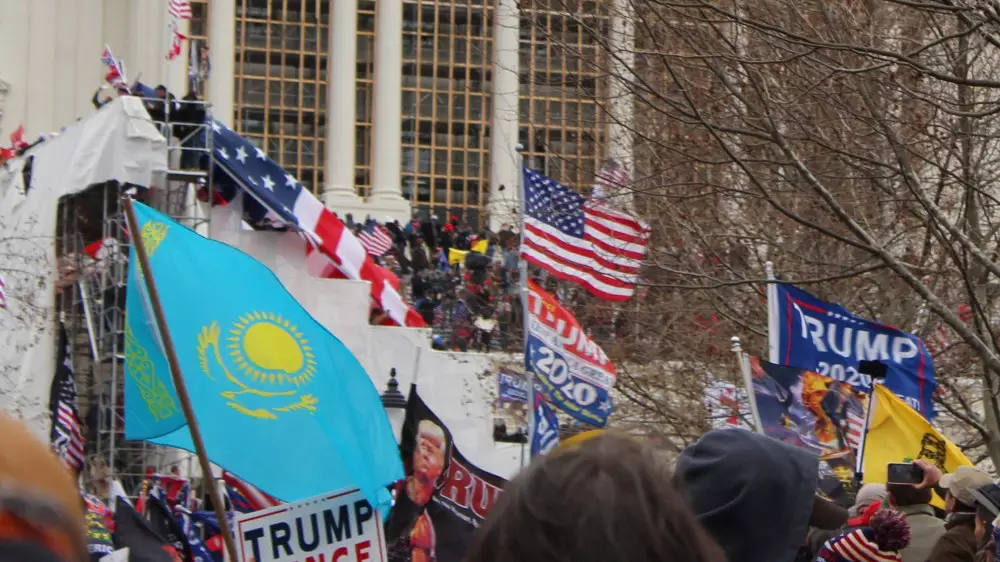 Казахстанский флаг заметили в руках у одного из штурмующих здание Капитолия в США. Пользователи Сети гадают, кто и зачем принес флаг Казахстана к Капитолию, передает Tengrinews.kz.