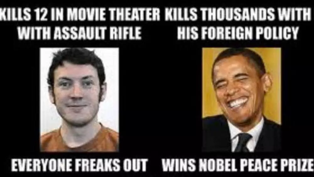 В городе Колдуэлл, штата Айдахо, члены оппозиционной политической организации вывесили в центре города рекламный щит, в котором сравнили деятельность президента США Барака Обамы с преступником из Колорадо Джеймсом Холмсом. Фотография Обамы появилась на электронном билборде рядом со снимком 24-летнего массового убийцы, находящегося в исправительном учреждении в ожидании предъявления ему официальных обвинений, с подписанным комментарием: "Убил 12 человек из автомата в кинотеатре - нарушил общепринятые нормы поведения, в том время как президент убил тысячи людей своей внешней политикой - получил Нобелевскую премию", - пишут неизвестные.