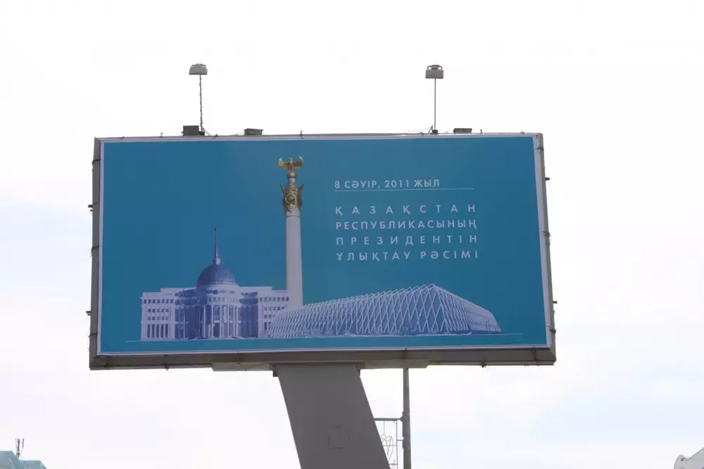 Это произошло незамедлительно после того, как Центральная избирательная комиссия объявила 8 апреля днем инаугурации Президента Республики Казахстан Нурсултана Назарбаева. На билбордах, помимо резиденции Президента Акорды, изображены монумент "Қазақ елi" и Дворец Независимости.