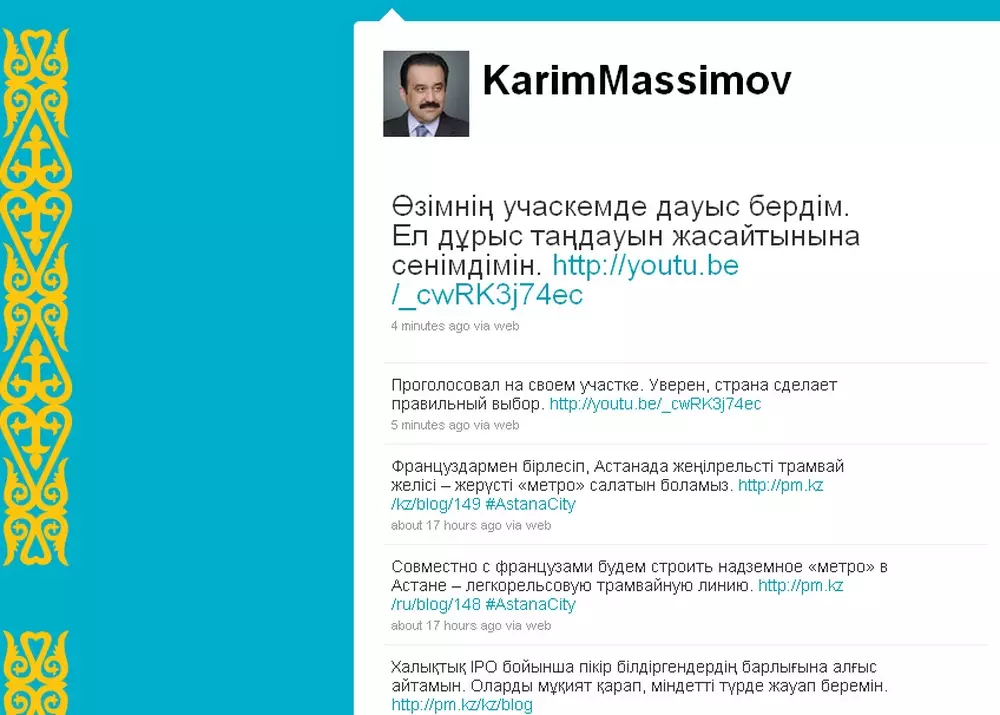 Премьер-министр Казахстана Карим Масимов написал в своем блоге, на страницах социальных сетей и на сайте сервиса для ведения микроблогов Twitter о президентских выборах. Глава кабмина РК поделился с пользователями Интернета: "Проголосовал на своем участке. Уверен, страна сделает правильный выбор". К записи прилагается видео, снятое во время визита семьи Масимовых на избирательный участок, расположенный в здании русского драматического театра Астаны.