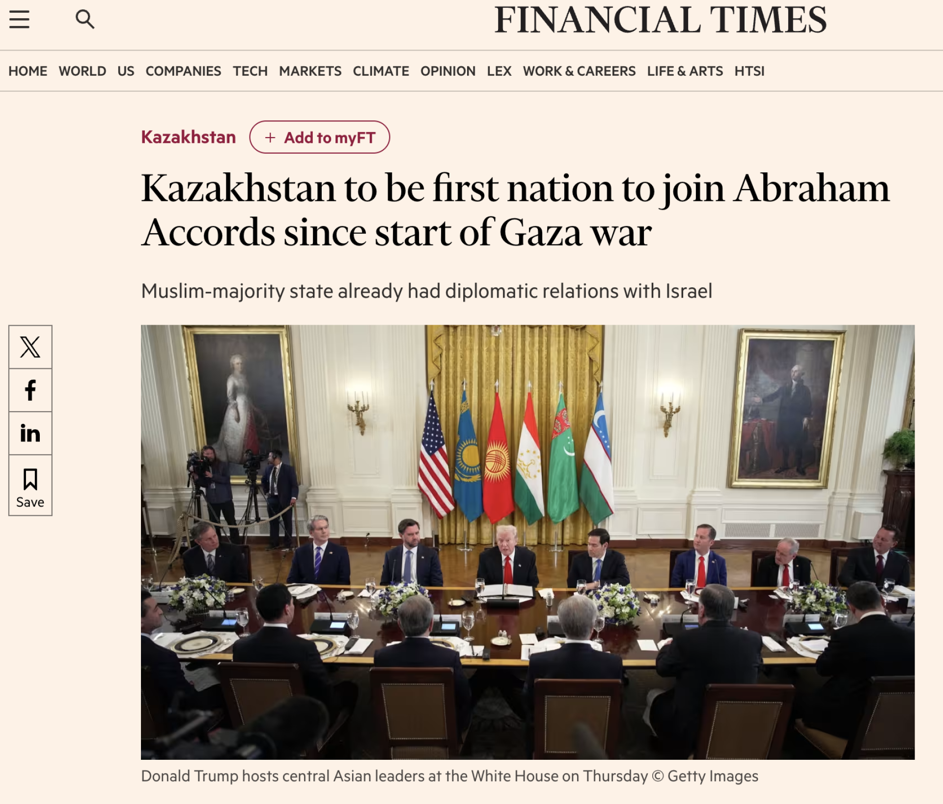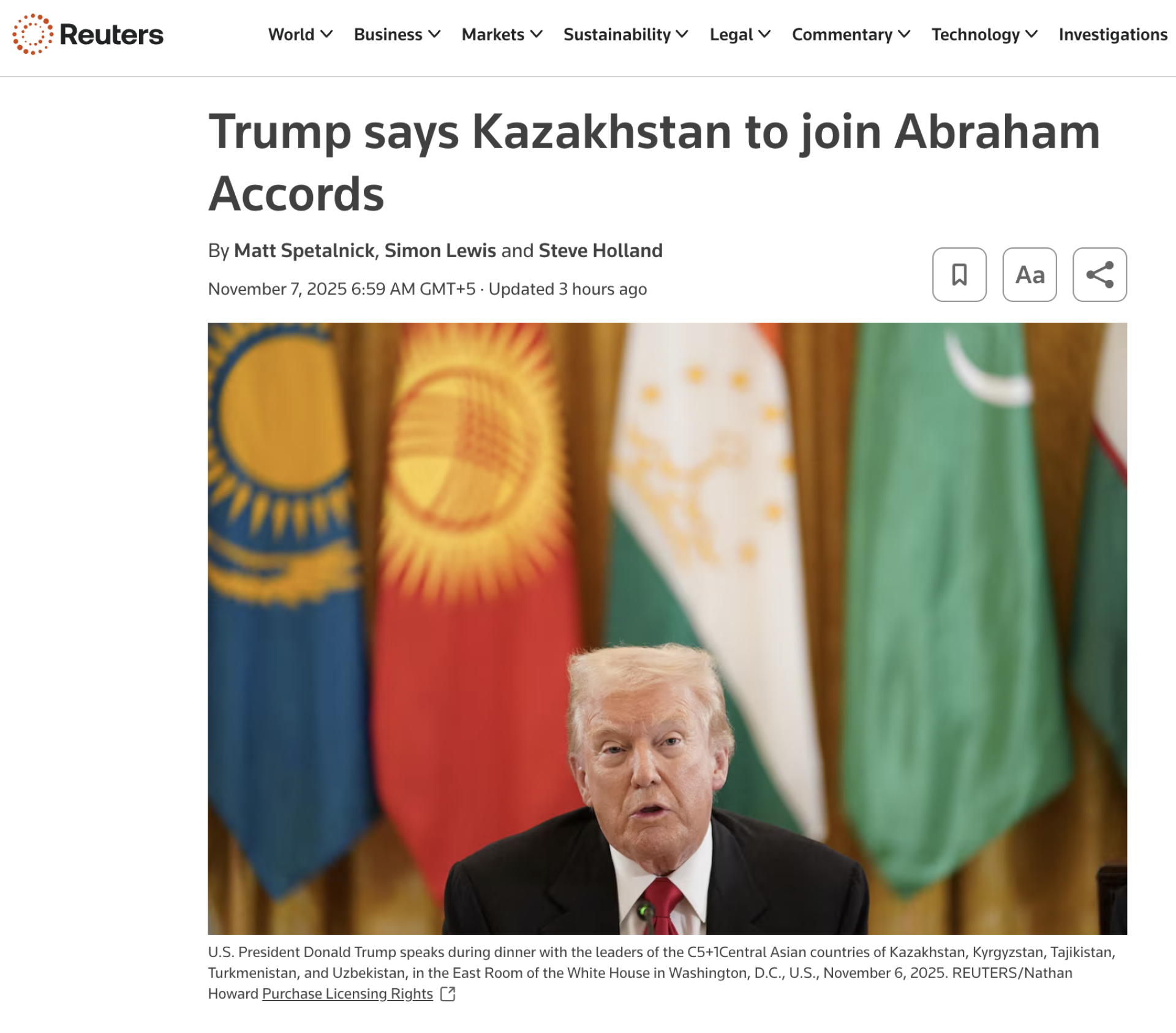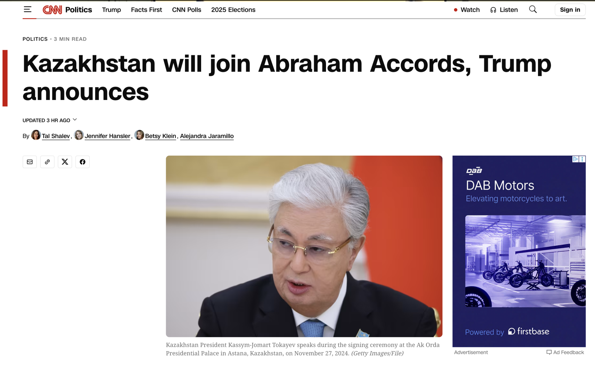 По данным CNN, Трамп подчеркнул, что Казахстан стал первой страной во время его второго президентского срока, присоединившейся к Авраамским соглашениям, и назвал это началом нового этапа международного партнёрства.