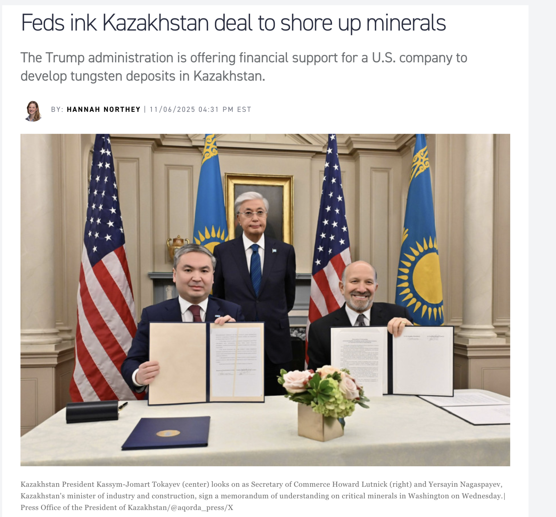 Издание E&E News by Politico сообщило, что администрация Дональда Трампа поддержала проект по разработке крупнейшего месторождения вольфрама в Казахстане. Cove Capital LLC создаёт совместное предприятие с национальной компанией Tau-Ken Samruk, а Экспортно-импортный банк США выразил готовность выделить до 900 миллионов долларов на его реализацию.