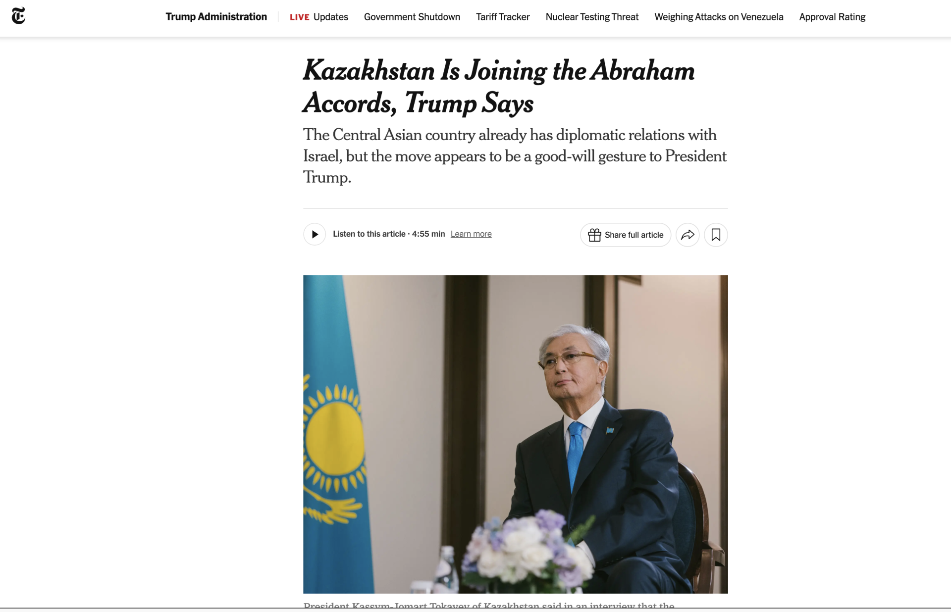 Издание The New York Times отметило, что визит Касым-Жомарта Токаева в Вашингтон стал знаковым для всего региона Центральной Азии. Газета обратила внимание на то, что Казахстан стал первой страной региона, присоединившейся к Авраамским соглашениям.