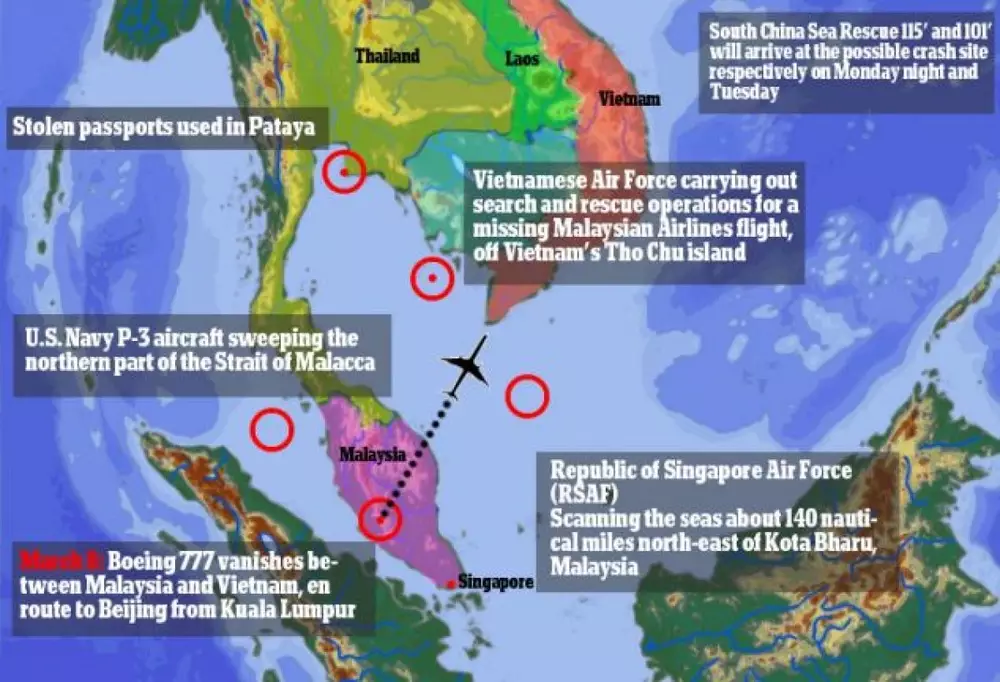 Напомним, самолет "Боинг-777" авиакомпании Malaysia Airlines летел по маршруту Куала-Лумпур - Пекин и исчез с экранов радаров в ночь на субботу. На борту лайнера находились 239 человек. Связь с воздушным судном прервалась над Южно-Китайским морем на полпути между восточным побережьем Малайзии и южной оконечностью Вьетнама. В районе предполагаемого места падения ведутся широкомасштабные поиски.