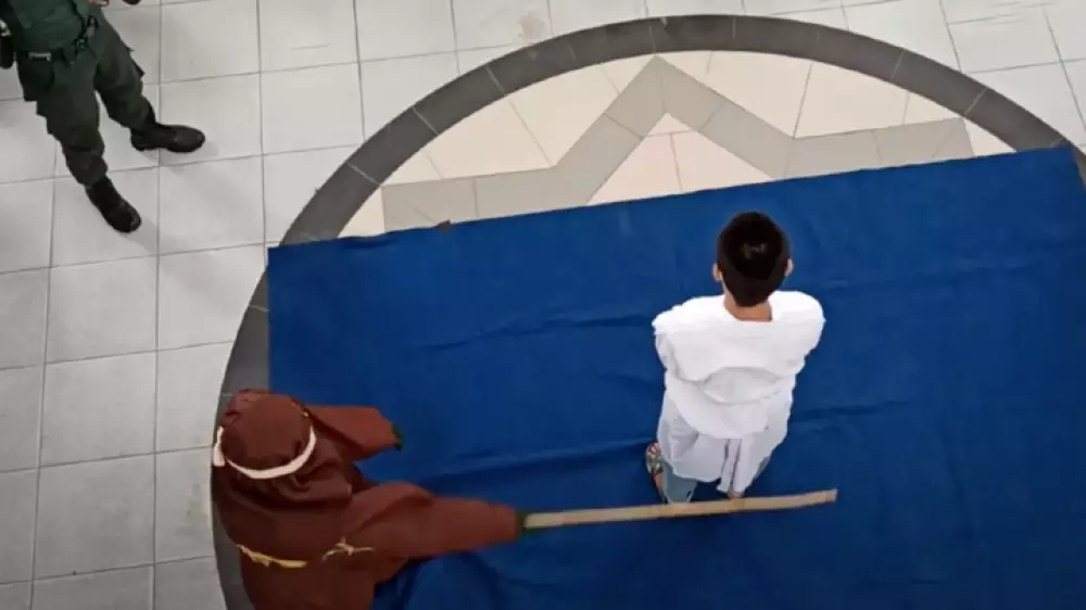 Отмечается, что во время исполнения наказания мужчины вздрагивали от боли и умоляли прекратить пытку ротанговой палкой.
