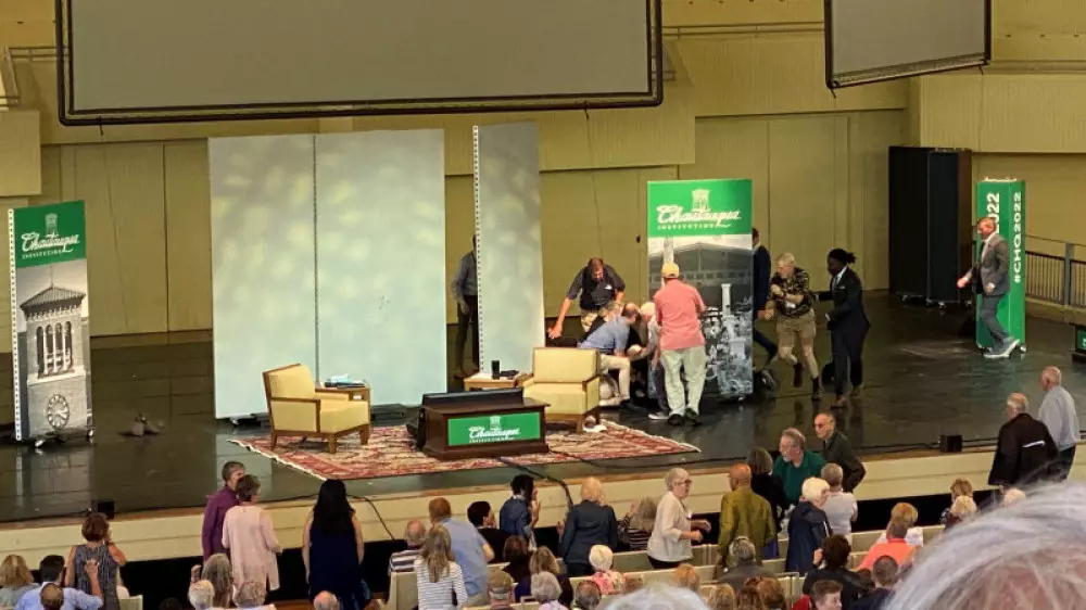 75-летний мужчина был ранен ножом в шею и живот прямо на сцене, когда готовился прочесть лекцию в штате Нью-Йорк.