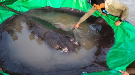 По словам ученых, 300-килограммовый скат, пойманный в реке Меконг в Камбодже, является самой крупной пресноводной рыбой из когда-либо зарегистрированных.