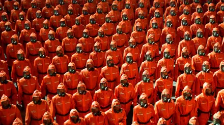 Государственные СМИ опубликовали фотографии солдат в оранжевых защитных костюмах с медицинскими масками в качестве символа усилий по борьбе с коронавирусом, а также войск, марширующих с винтовками и несколькими реактивными установками залпового огня на площади Ким Ир Сена в Пхеньяне.