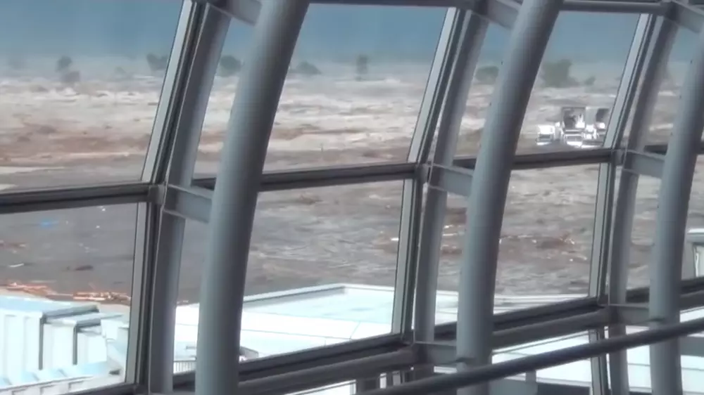 На кадрах видно, как здание воздушной гавани сильно трясет несколько минут. Люди при этом находятся внутри. Затем с берега моря в сторону аэропорта быстро надвигается вода, смешанная с грязью и обломками. Стихия смывает все на своем пути.