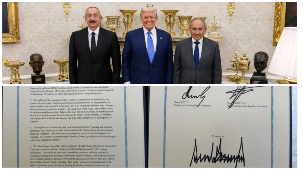 В документе отмечается, что главы государств и президент США стали свидетелями парафирования текста Соглашения об установлении мира и межгосударственных отношений между Азербайджаном и Арменией. Лидеры признали необходимость дальнейших шагов для подписания и ратификации соглашения, а также подчеркнули важность укрепления мира между двумя странами.