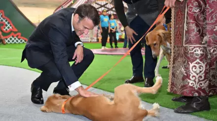 Собаки заинтересовали Макрона во время визита в Казахстан, когда он посетил в Астане выставку "Этноаул". На ней президент Франции и увидел казахских тазы.