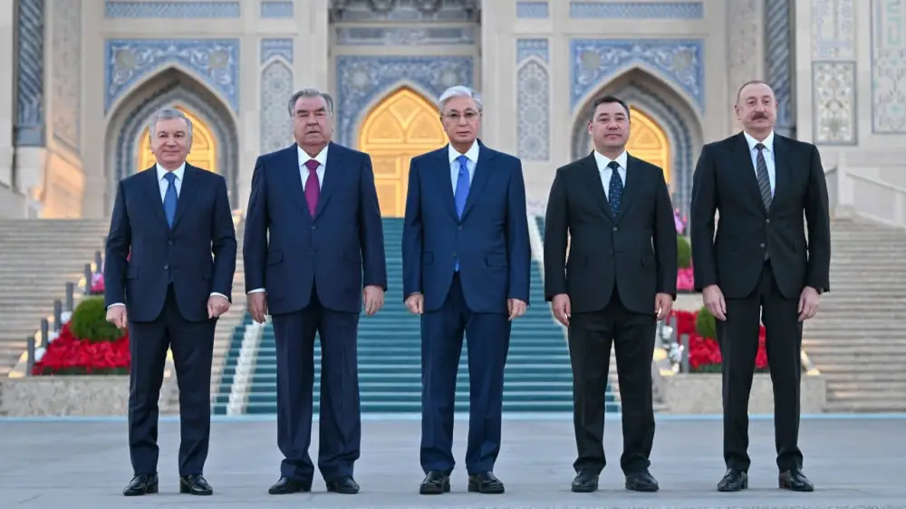 Пресс-служба Главы государства опубликовала совместное фото Касым-Жомарта Токаева, Шавката Мирзиёева, Ильхама Алиева, Садыра Жапарова и Эмомали Рахмона на фоне здания Центра.