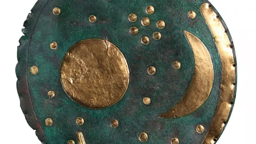 Бронзовый диск диаметром 30 сантиметров, покрытый патиной цвета аквамарина, со вставками из золота, изображающими Солнце, Луну и 32 звезды, в том числе скопление Плеяды, был обнаружен в Германии в 1999 году и считается одной из самых важных находок и археологической сенсацией XX века.