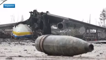 Корреспондент Ирина Куксенкова в репортаже рассказала, что украинские военные попали снарядами в ангар, где находилась "Мрия". Самолет был на ремонте и не успел вылететь из Украины.