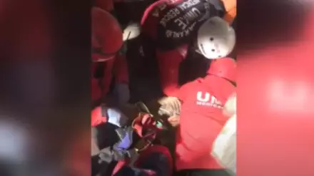 На кадрах, опубликованных агентством, показана спасательная операция. Сначала спасатели разгребают завалы, затем несут пострадавшего к карете скорой помощи.