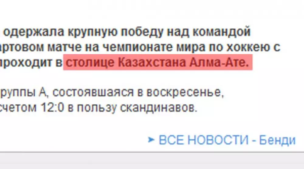 Ошибка была допущена в новости, опубликованной на сайте спортивного канала Eurosport. Речь шла о чемпионате мира по бенди, который в эти дни проходит на Медеу и на Центральном стадионе в Алматы. "Сборная Швеции одержала крупную победу над командой Финляндии в стартовом матче на чемпионате мира по хоккею с мячом, который проходит в столице Казахстана Алма-Ате. Встреча команд группы А, состоявшаяся в воскресенье, завершилась со счетом 12:0 в пользу скандинавов", пишут журналисты Eurosport.