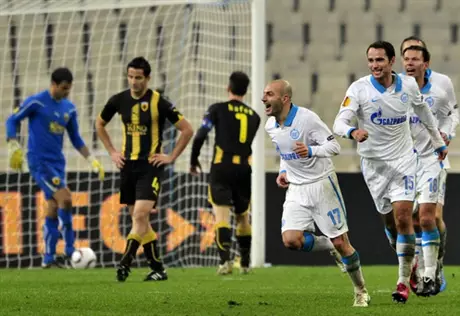 Питерский "Зенит" разгромил в матче Лиги Европы греческий АЕК и вышел в прей-офф чемпионата, сообщается на официальном сайте УЕФА. Матч, который проходил на стадионе "Спирос Луис" в Афинах, закончился со счетом 3:0. Счет на 43-й минуте открыл нападающий питерской команды Александр Бухаров. Во втором тайме отличились Алессандро Розина (67-я минута) и Игорь Денисов (88-я минута). Греки имели возможность забить, когда на 40-й минуте рефери назначил пенальти в ворота Игоря Малафеева. Однако Исмаэль Бланко пробил выше ворот. "Зенит" занял в группе G первое место, не проиграв ни одной игры группового этапа. Второе место в группе досталось бельгийскому "Андерлехту", который дома переиграл хорватский "Хайдук" со счетом 2:0.