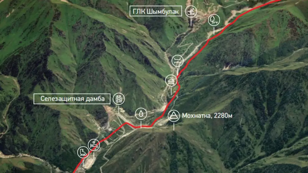 Примерно через 1 км тропы вы сравняетесь с горнолыжным курортом "Шымбулак" на противоположной стороне реки. Тропа будет чередоваться альпийскими лугами с небольшими пролесками тянь-шанской ели и кустарниками. В первом перелеске место отдыха. Здесь можно полюбоваться видом на "Шымбулак" и перевал Талгарский.