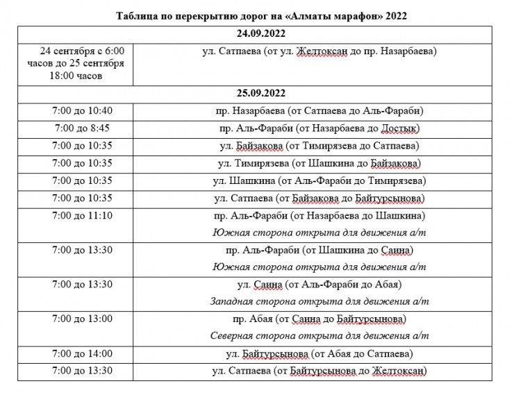 Оргкомитет бегового соревнования "Алматы марафон" информирует жителей южной столицы о частичном перекрытии дорог в день соревнования.