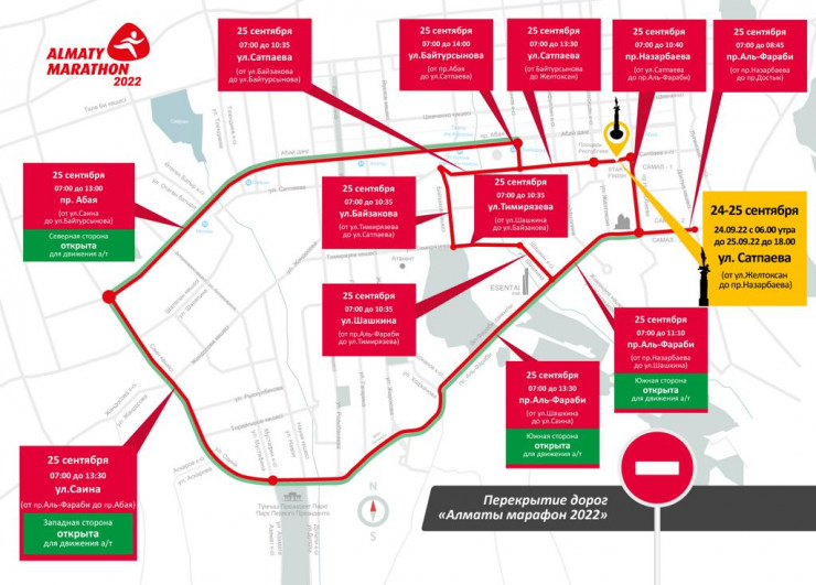 Старт и финиш марафона будут расположены на площади Республики, поэтому по улице Сатпаева от улицы Желтоксан до проспекта Назарбаева, будут перекрыты обе полосы движения с 06.00 часов 24 сентября до 18.00 часов 25 сентября.