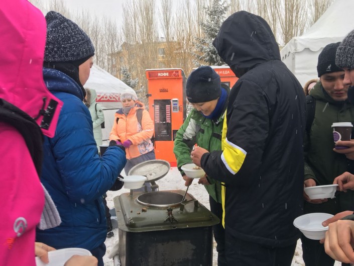В дороге участников подкрепляли водой, горячим чаем и энергетическими батончиками. А для финишеров разбили полевую кухню и подавали горячую солдатскую кашу.