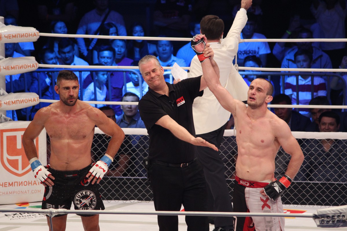 В весе до 84 килограммов казахстанский боец Еркинбек Инжель проиграл россиянину Артему Фролову. Бой завершился в первом раунде.