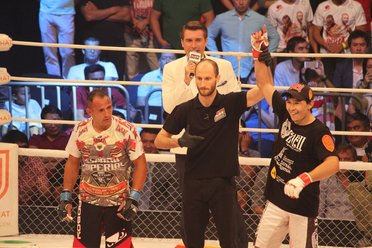 В весе до 70,3 килограмма казахстанский боец Дамир Исмагулов одержал победу в первом раунде над испанцем Педро Эуженио Гранхо.
