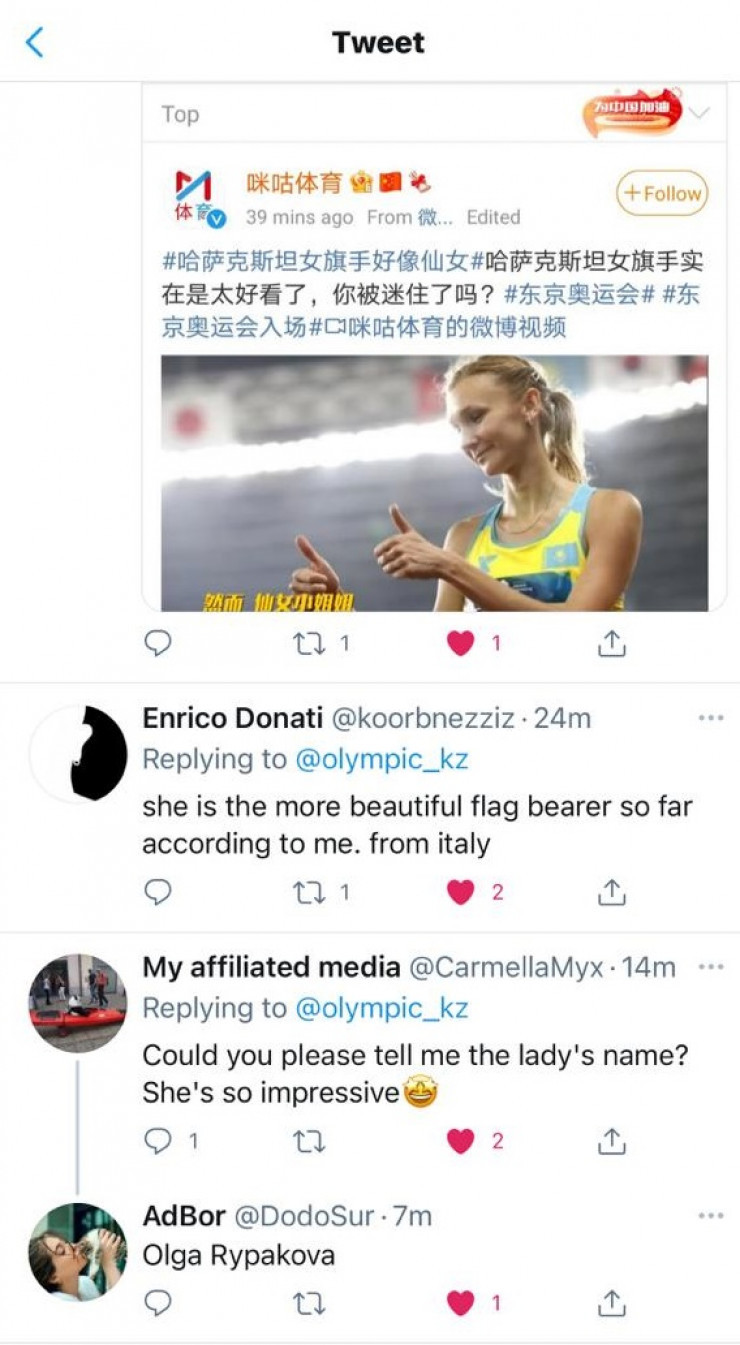 Легкоатлетка Ольга Рыпакова выступила знаменосцем казахстанской делегации на открытии Олимпиады в Токио. После ее появления в национальном костюме японские пользователи Twitter начали оставлять десятки восторженных сообщений, передает Tengrinews.kz.