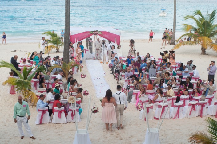 Свадьба на морском побережье - это самый распространенный вариант доминиканской свадьбы, европейская церемония, которая проводится на берегу моря. Шикарный пейзаж, шум прибоя, белоснежный песок - сложно представить более романтичную атмосферу для заключения брака. Как правило, место проведения украшают цветами - свадебная арка, букеты, бокалы и другие детали оформляются каким-то одним видом цветов, либо свадьба в морском стиле, когда для украшения используются ракушки. Если опустить детали оформления, то в этот стандартный набор входят: украшение места церемонии (арка, цветы, стулья для гостей), трансфер из отеля, сама церемония (как правило, на английском или испанском), букет невесты и бутоньерка жениха, бутылка шампанского для церемонии. Дополнительно могут быть оплачены вечерний ужин в ресторане, услуги фотографа и трио карибских музыкантов для сопровождения церемонии.