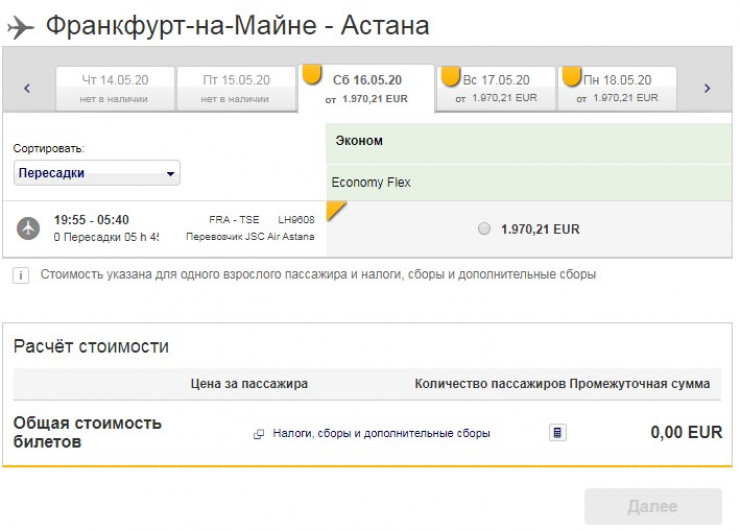 Прямой рейс во Франкфурт из Нур-Султана возможен также 11 мая, стоимостью 344 603 тенге. Последующие даты вылетов начинаются с 16 мая, по цене от 215 225 тенге. Обратный рейс в Казахстан отображается только на 16 мая, и система выдает одно оставшееся место.