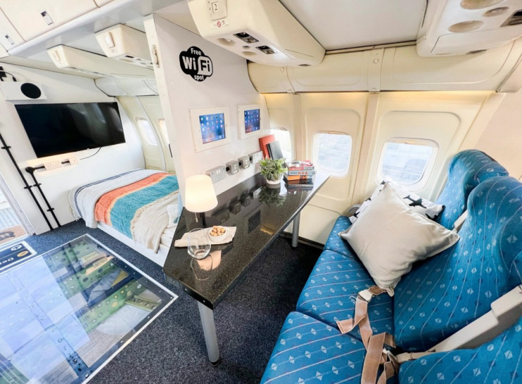 Посетители попадают в самолет по посадочному трапу, а в салоне найдут оригинальные аксессуары: кресла, подвесные шкафчики и даже симулятор полета в кабине пилота.